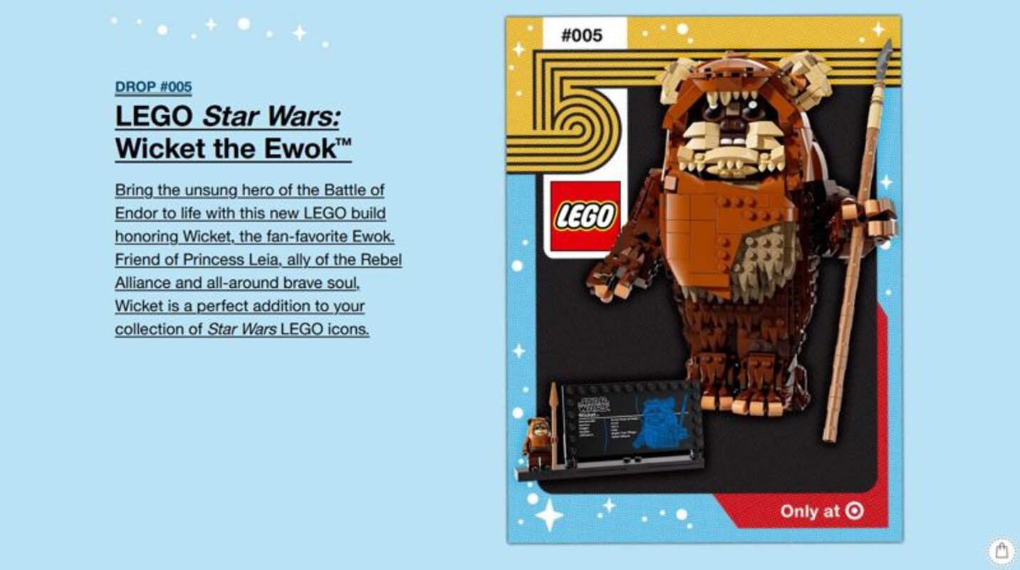 Shown below is the new LEGO Target Summer Geek Out Star Wars Wicket the Ewok Building Toy is available for pre-order at Target.com.Kids ages 12 and up can build the galaxy's bravest little warrior with the LEGO Star Wars: Return of the Jedi Wicket the Ewok (75430) for boys and girls. This detailed building set captures the brave Ewok who helped topple the Empire with courage and forest cunning. Young builders construct Wicket with authentic details including his signature spear, textured fur, expressive eyes, and distinctive tribal hood. Once built, Wicket becomes impressive room decor that celebrates one of Star Wars' most beloved characters. Perfect for kids who love detailed building challenges and iconic Star Wars characters, this set offers hours of engaging construction followed by dynamic display possibilities. The buildable figure can be posed for action scenes or displayed proudly as a tribute to Endor's bravest defender. Makes an ideal birthday or holiday gift for boys and girls who enjoy building toys and Star Wars adventures. Contains 1,010 pieces.