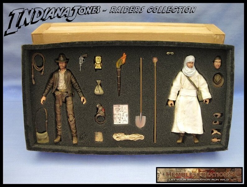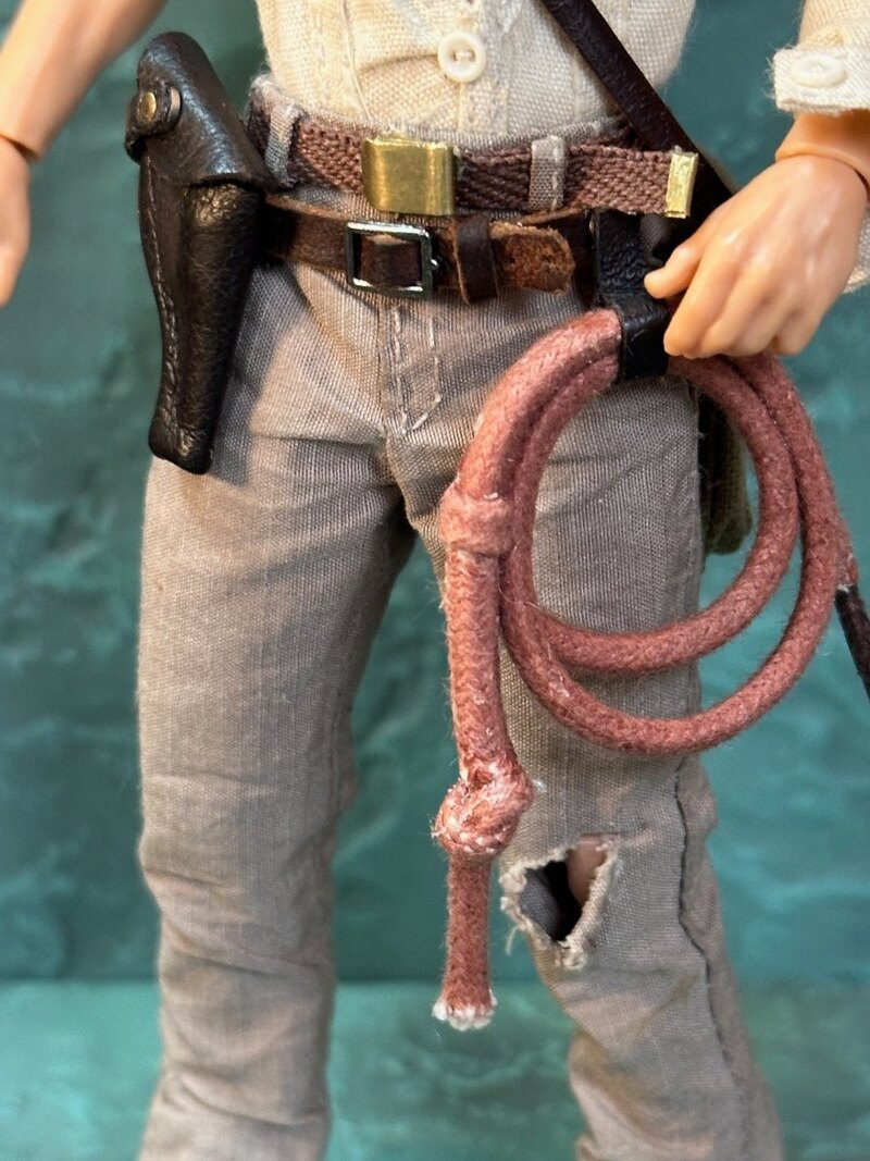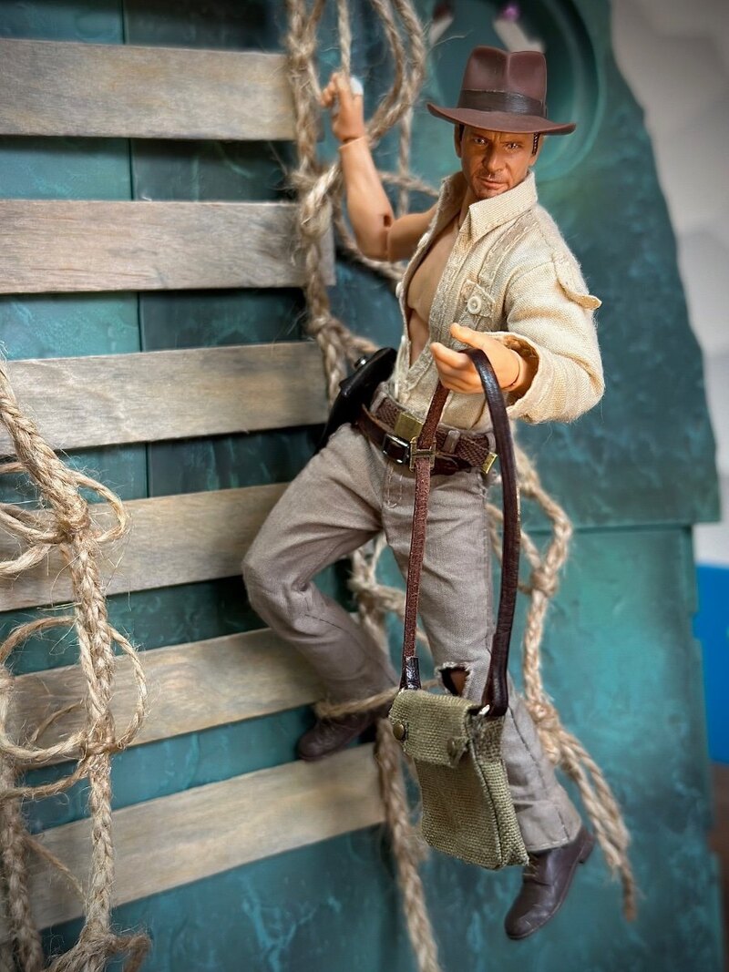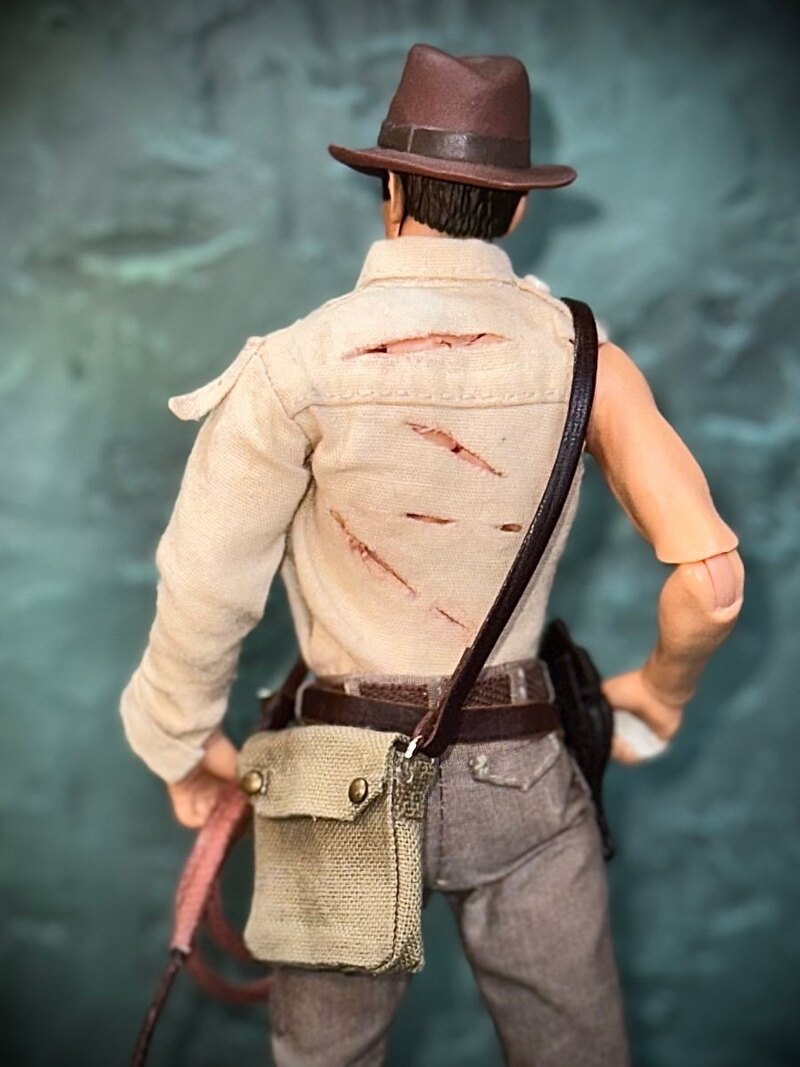 Indiana Jones’s head sculpt is from that stellar SH Figuarts figure. I retrofitted the neck of an hypnotized Indy torso from Hasbro and legs are from a First Line up figure. I handmade all clothes, bag, whips and leather belt and holster. Holster and bag can open and close thanks to tiny magnets.