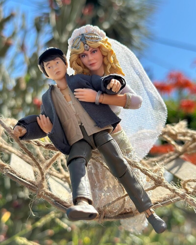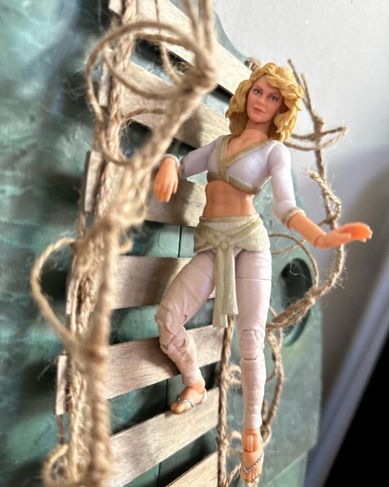 Willie Scott took a lot of imagination and different parts. Hairdo was assembled strand by strand (harvested from a ML Jane Foster figure) and she comes with an alternate head. Face is a repainted / resculpted Hasbro Power Rangers head. Body combines many different parts including Emma Frost’s cleavage and GI Joe’s Zarana’s abs. Chain headpiece was made from ML Dazzler’s necklace.