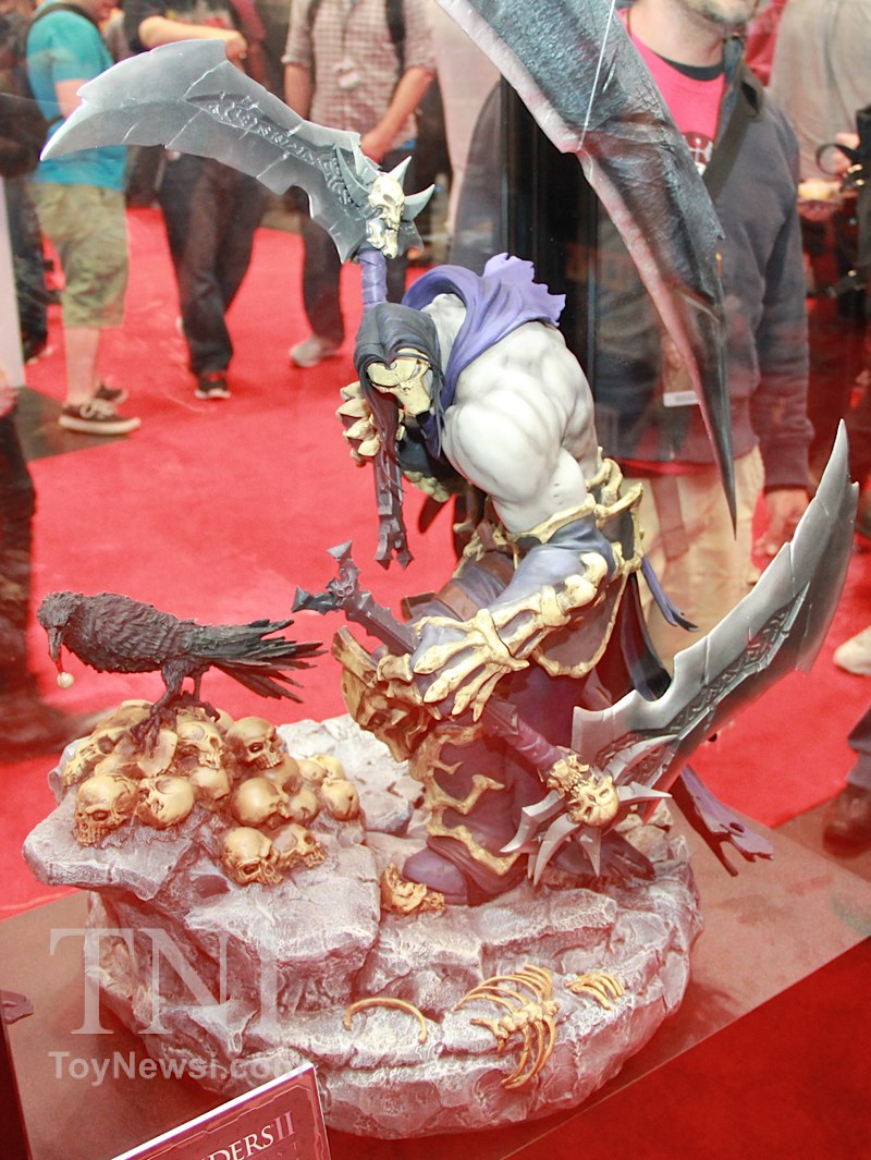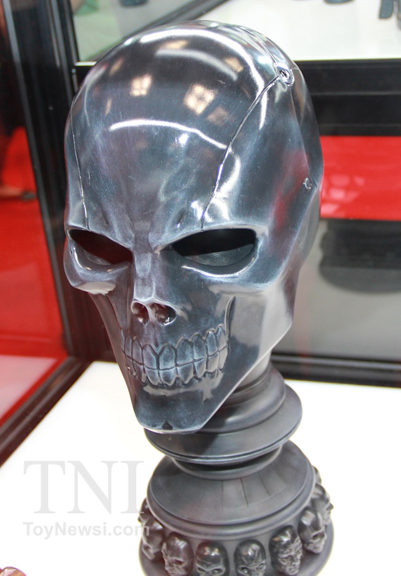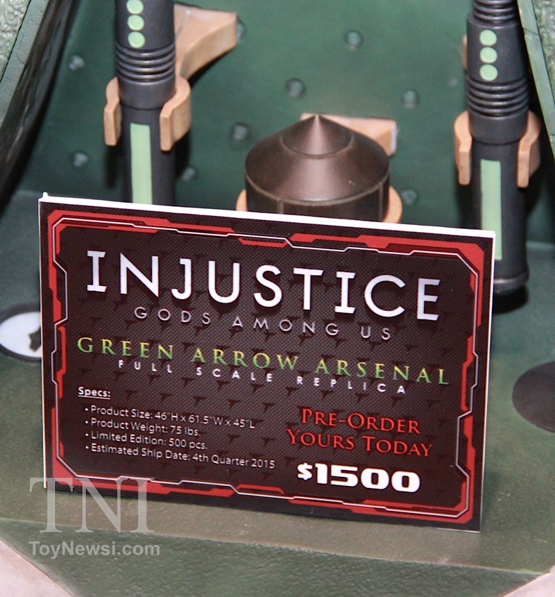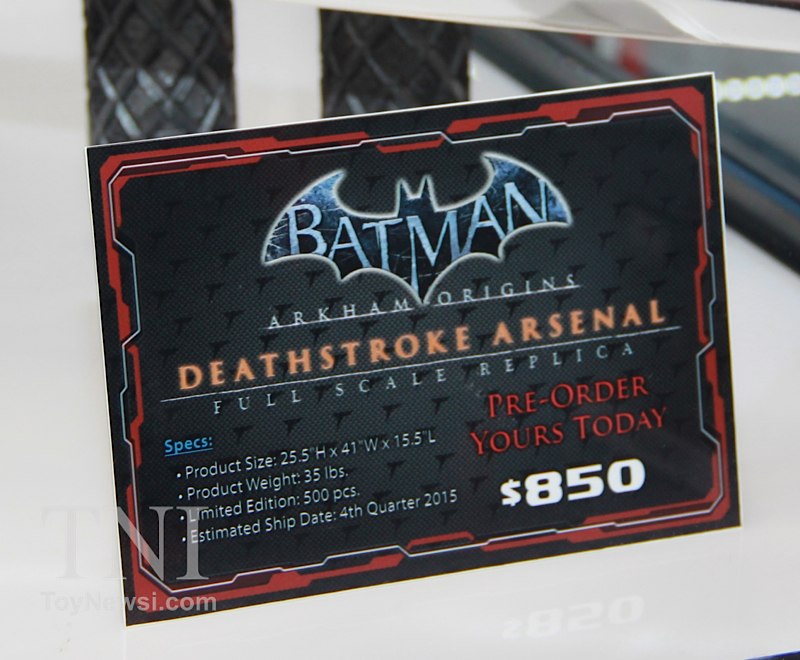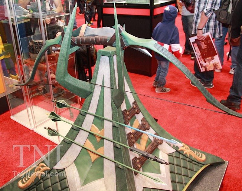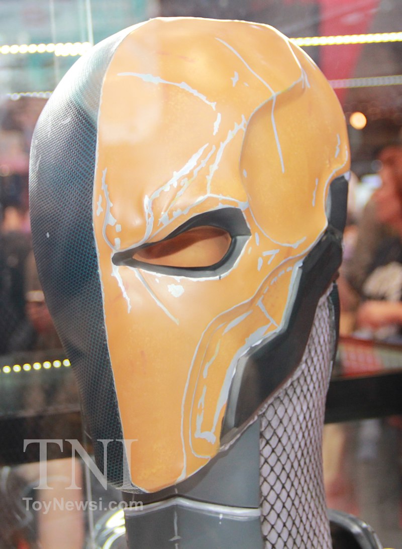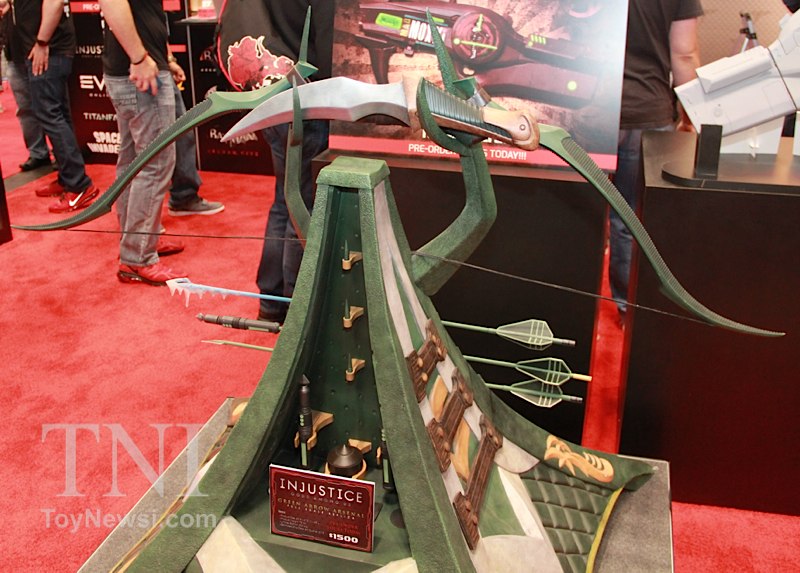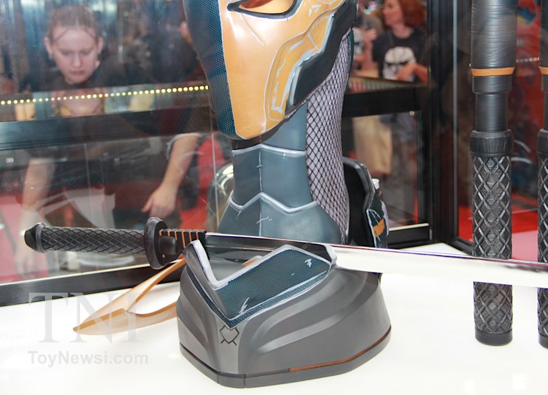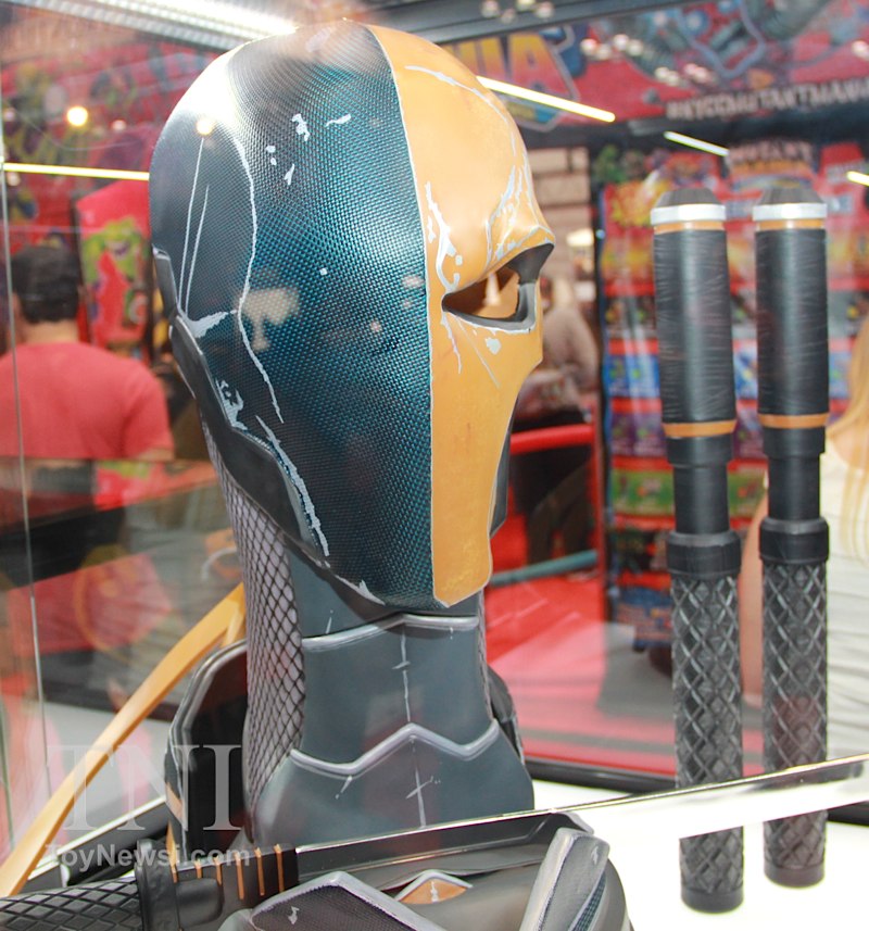 Shown below are product images from the TriForce booth at the 2014 New York Comic Con. Things to note are the Deathstroke mask and sword replica from the Batman: Arkham Origins video game as well as a replica for Green Arrow's bow and arrows from the DC Injustice video game.