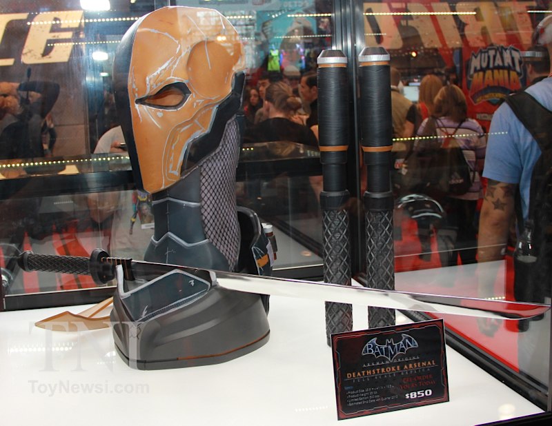 Shown below are product images from the TriForce booth at the 2014 New York Comic Con. Things to note are the Deathstroke mask and sword replica from the Batman: Arkham Origins video game as well as a replica for Green Arrow's bow and arrows from the DC Injustice video game.